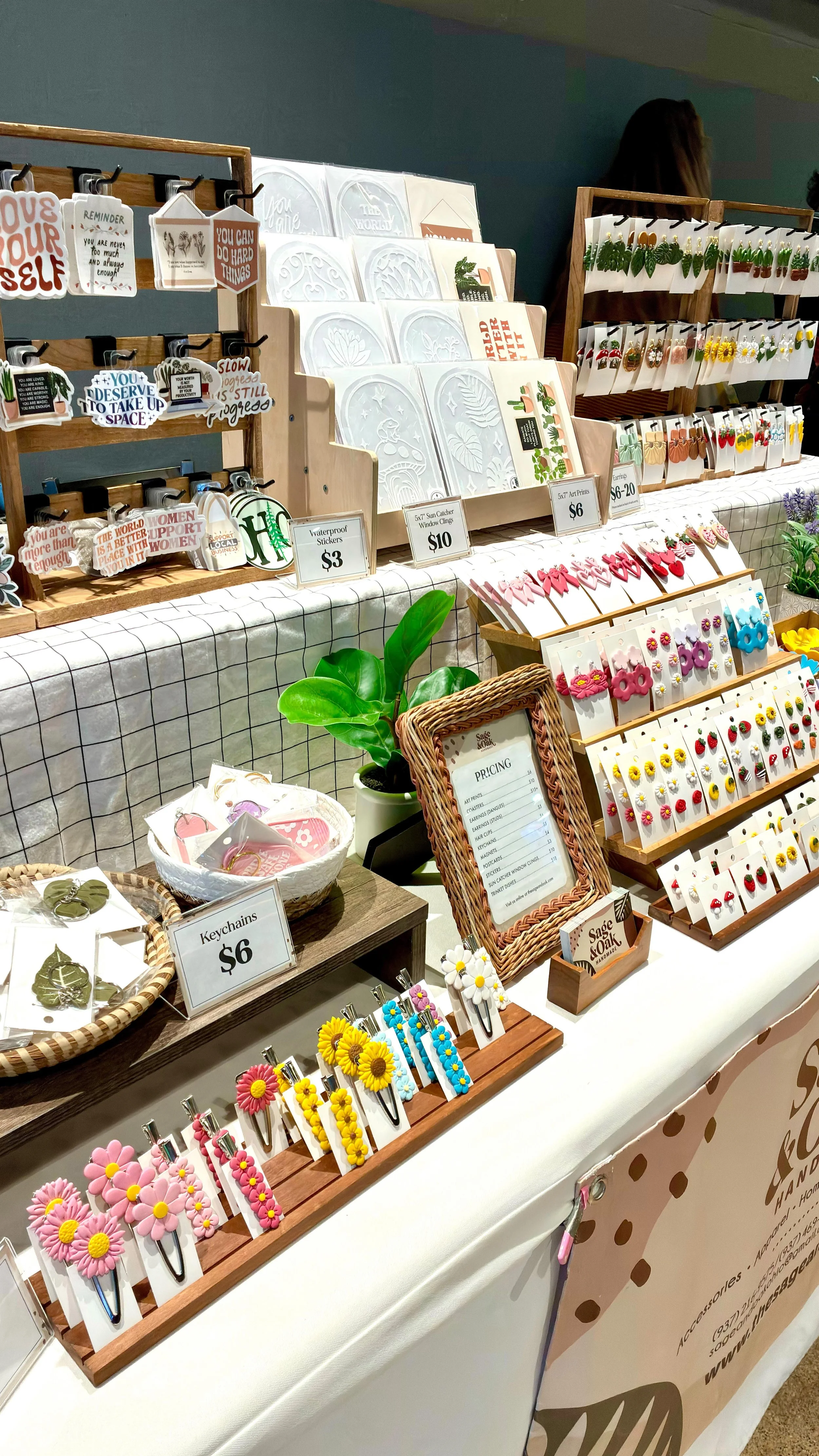 Grab a delicious coffee and shop a small selection of our waterproof stickers and polymer clay earrings.